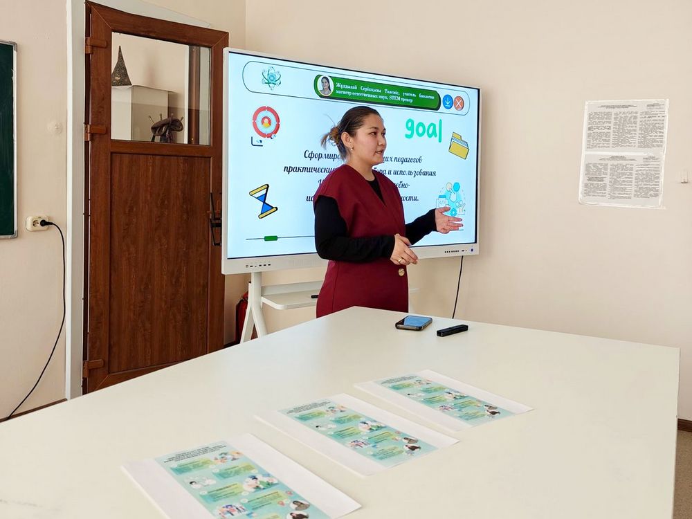 The speaker was Tölemis Zhuldizai, a biology teacher at the specialized school “Ozat,” Master of Natural Sciences, expert-level educator, and nationally certified STEAM trainer within the Jana Talap project.