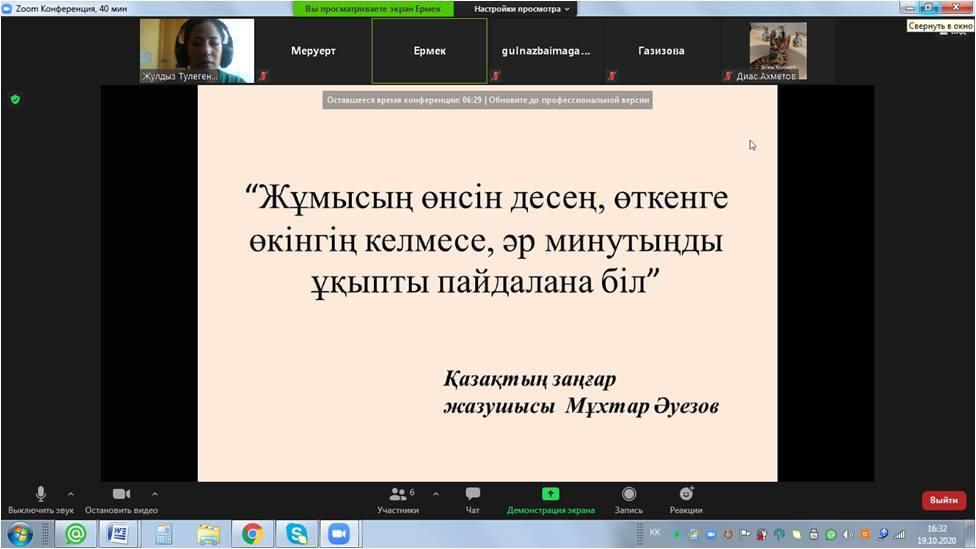 Сегодня на платформе ZOOM состоялся кураторский час для студентов 1 курса кафедр Бухгалтерский учет и управление, Государственное и местное управление, Учет и аудит Костанайского регионального университета им. А. Байтурсынова и учащихся 11 класса средней школы п. Заречный, обучающихся на государственном языке. Кураторский час прошел под лозунгом «Зря потратил время - зря потратил жизнь» и познакомил ребят с методами тайм-менеджмента, основанными на книгах, которые вышли в рамках программы «Рухани жаңғыру», в частности, «100 новых учебников по гуманитарным наукам на казахском языке».